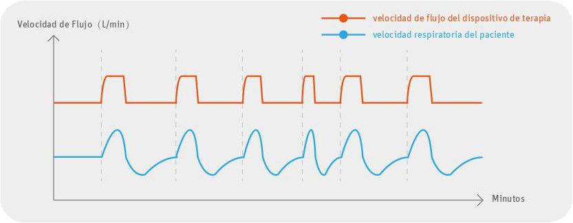 Siga cada respiración del paciente, cambie el flujo entre respiraciones, ofrece un flujo más alto al inhalar y un flujo más bajo al exhalar, siga cada respiración como un ventilador de dos niveles, recursos de oxígeno cómodos y más económicos en oxígeno.